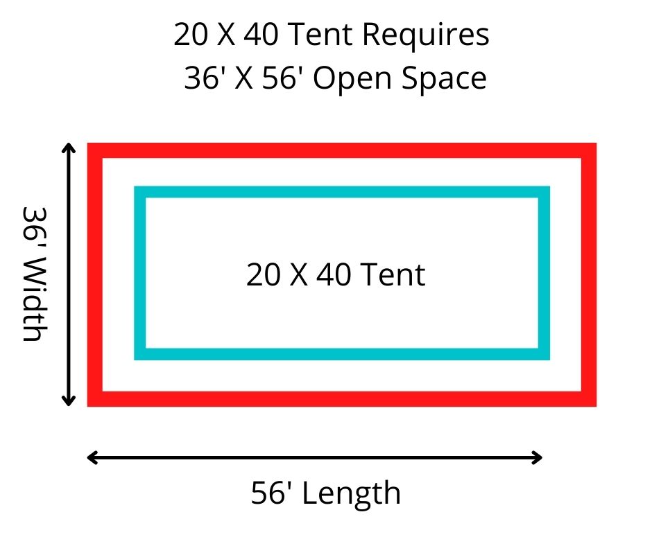 Space Required: Please ensure that you have ample space for a tent! The tents require stakes that need to go outside of the perimeter of the tent. The area needs to be reasonably flat, free of overhead branches and power lines, and we need to know where underground lines, such as sprinklers are located. Please follow these guides for spacing: